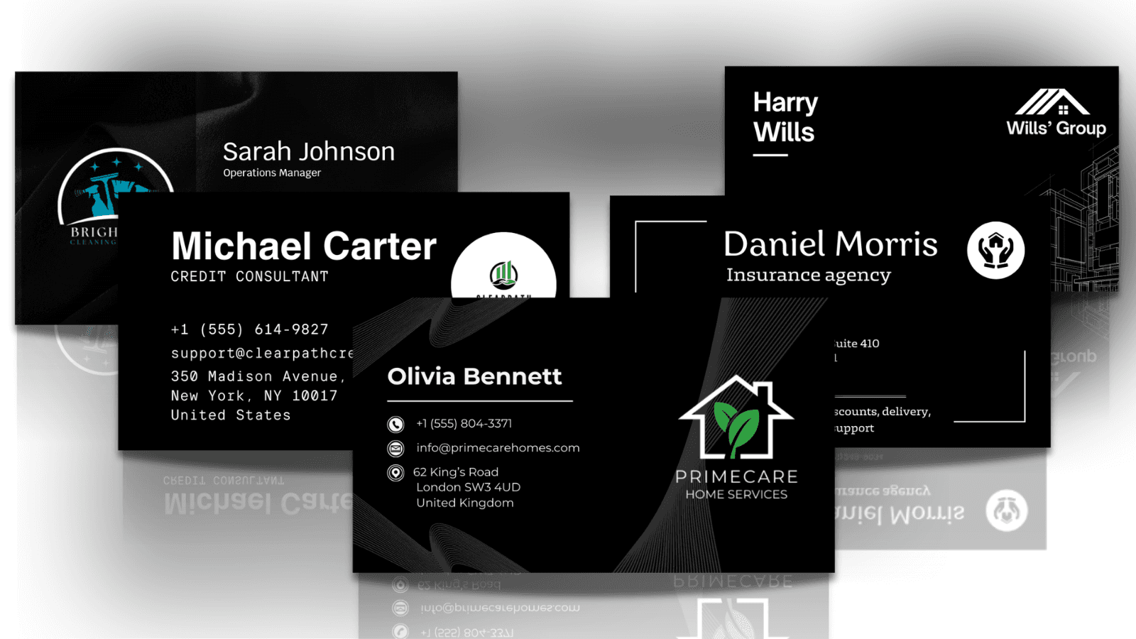 Designed professional business cards for insurance, home care, credit repair, and cleaning businesses, focusing on clarity, trust, and brand consistency across different industries.